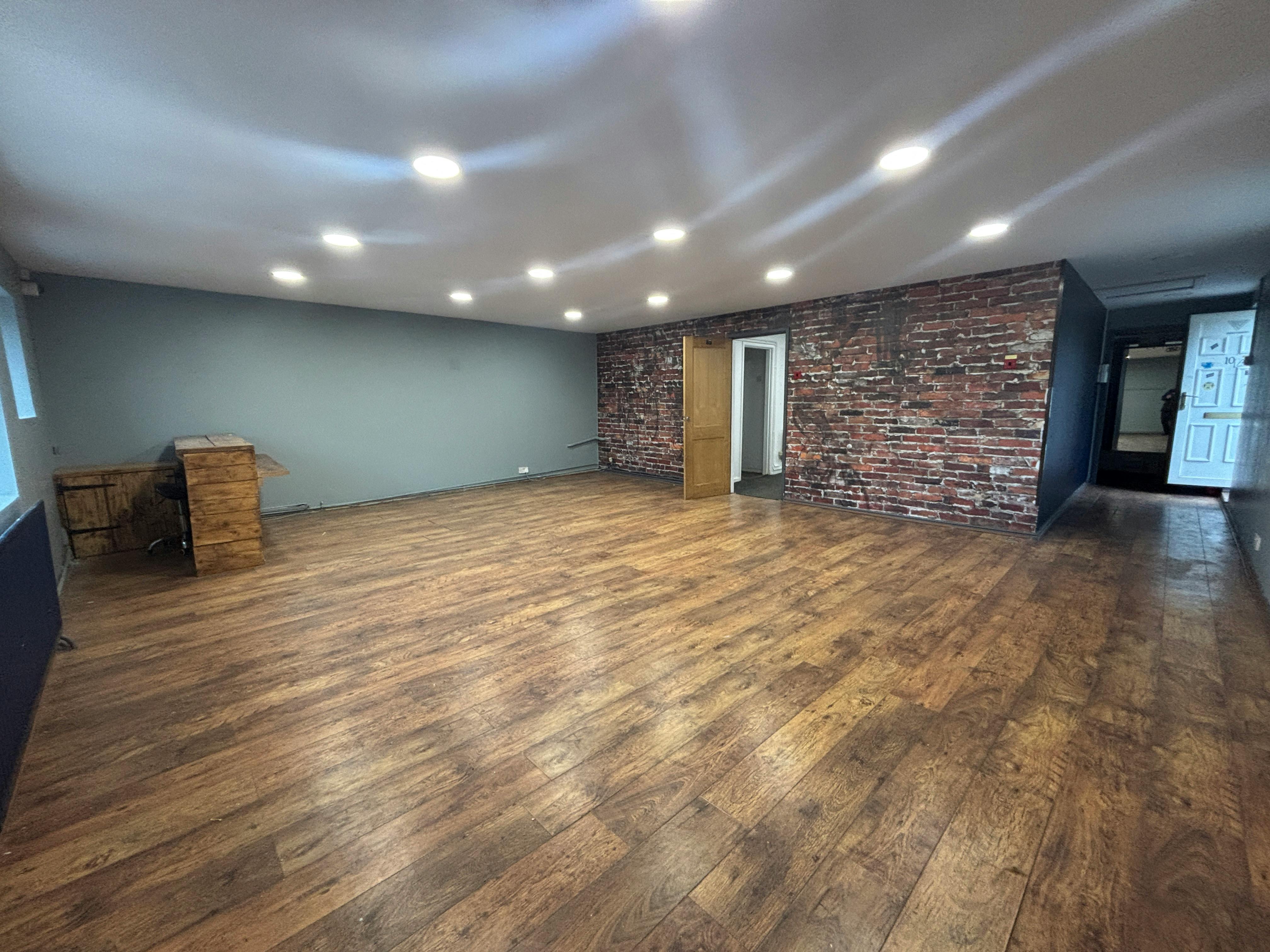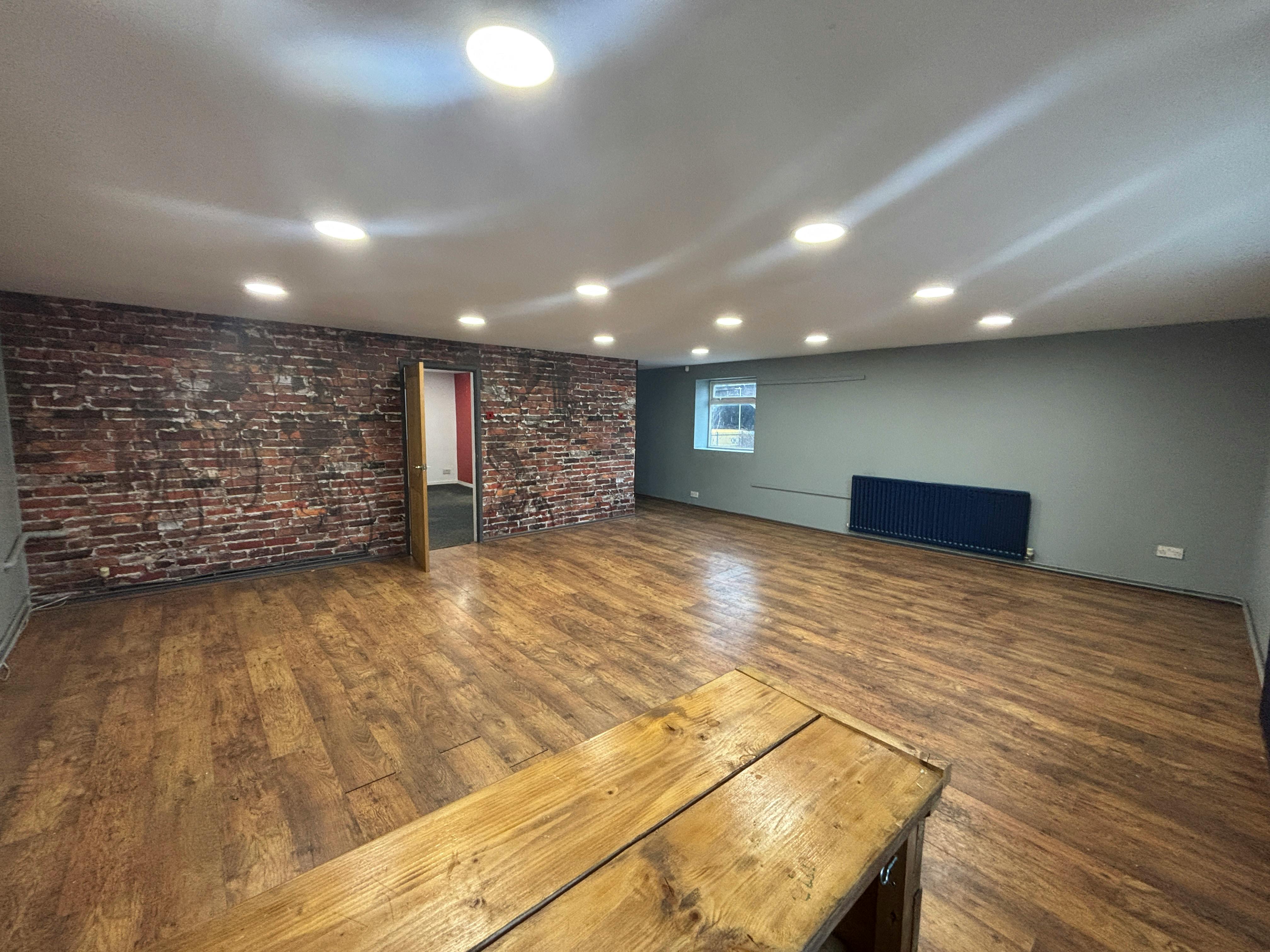The protruding first floor section is accessed from the external spiral staircase, leading into an area currently used as a showroom but could also be offices, with laminate flooring, plastered ceilings and LED lighting. To the rear is an office, kitchen and access through to two further offices and ladies & gents WCs, making up the remainder of the first floor. There is a second staircase to the left side of the building from the yard. Benefits include: